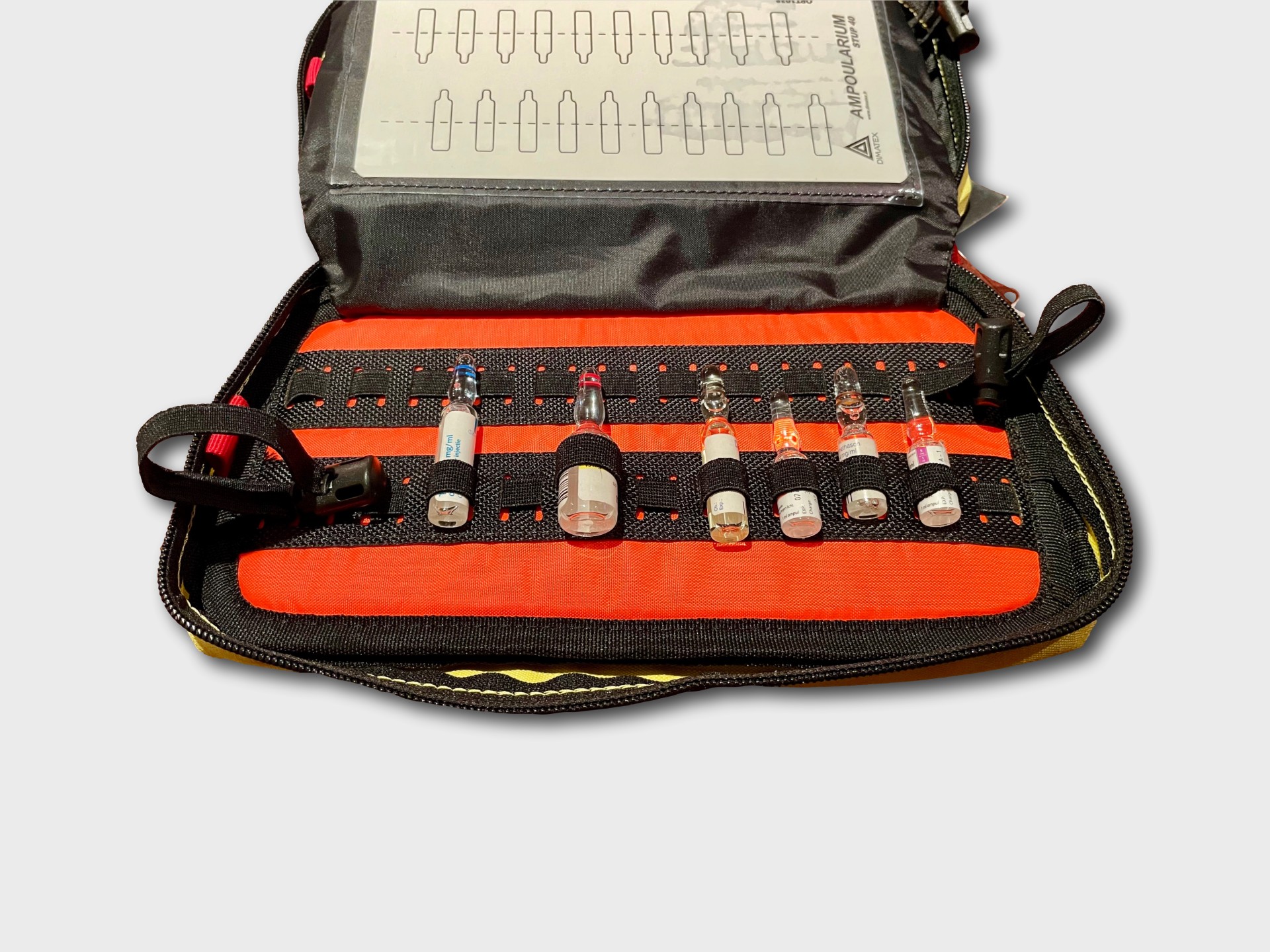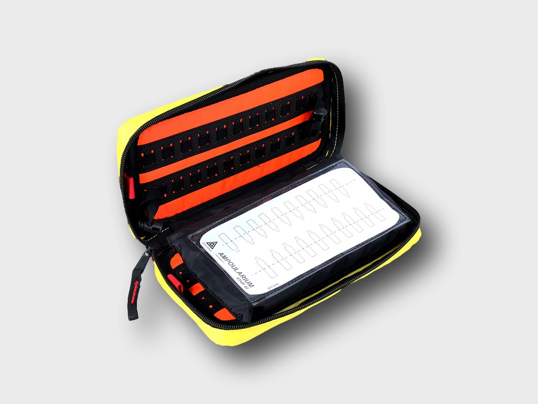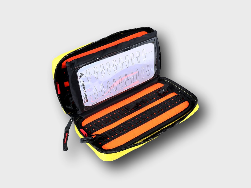 Made from robust Nylon Ripstop 450D with additional reinforcement to protect sensitive ampoules from shocks and vibrations. The foam-padded transparent intermediate flap provides extra protection and space for content description, allowing you to see immediately which medication is present.