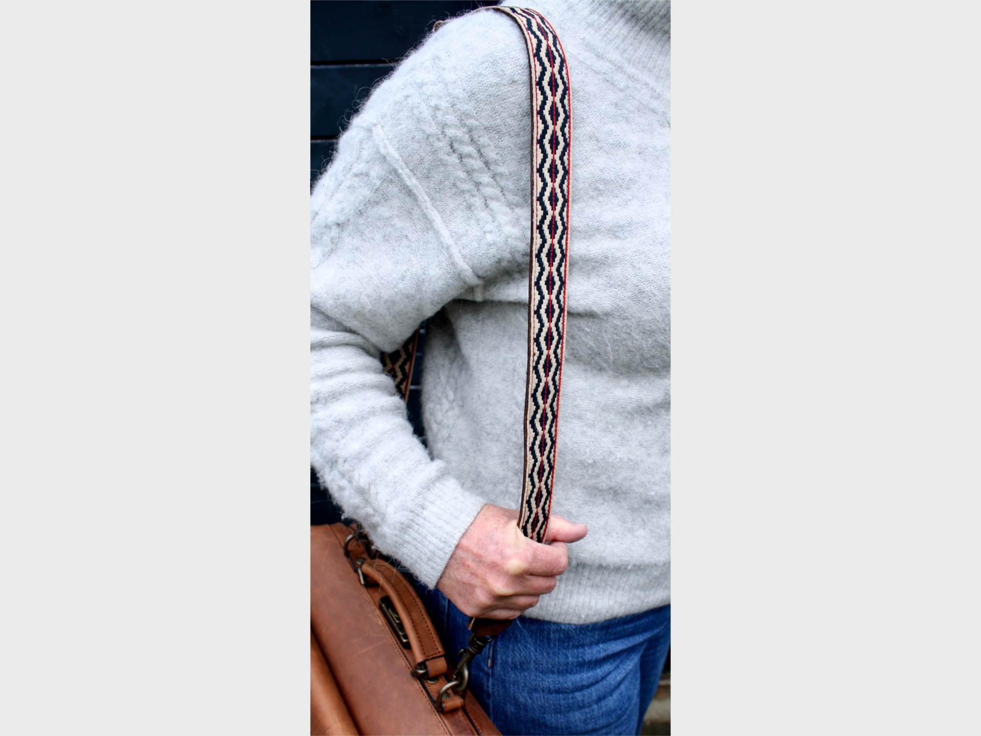 The leather of the McFermoir fashion shoulder strap may initially transfer slightly onto light-coloured clothing. Therefore, it is advisable to wear the McFermoir shoulder strap with the fabric side facing the clothing initially. After several uses, the leather will no longer transfer.