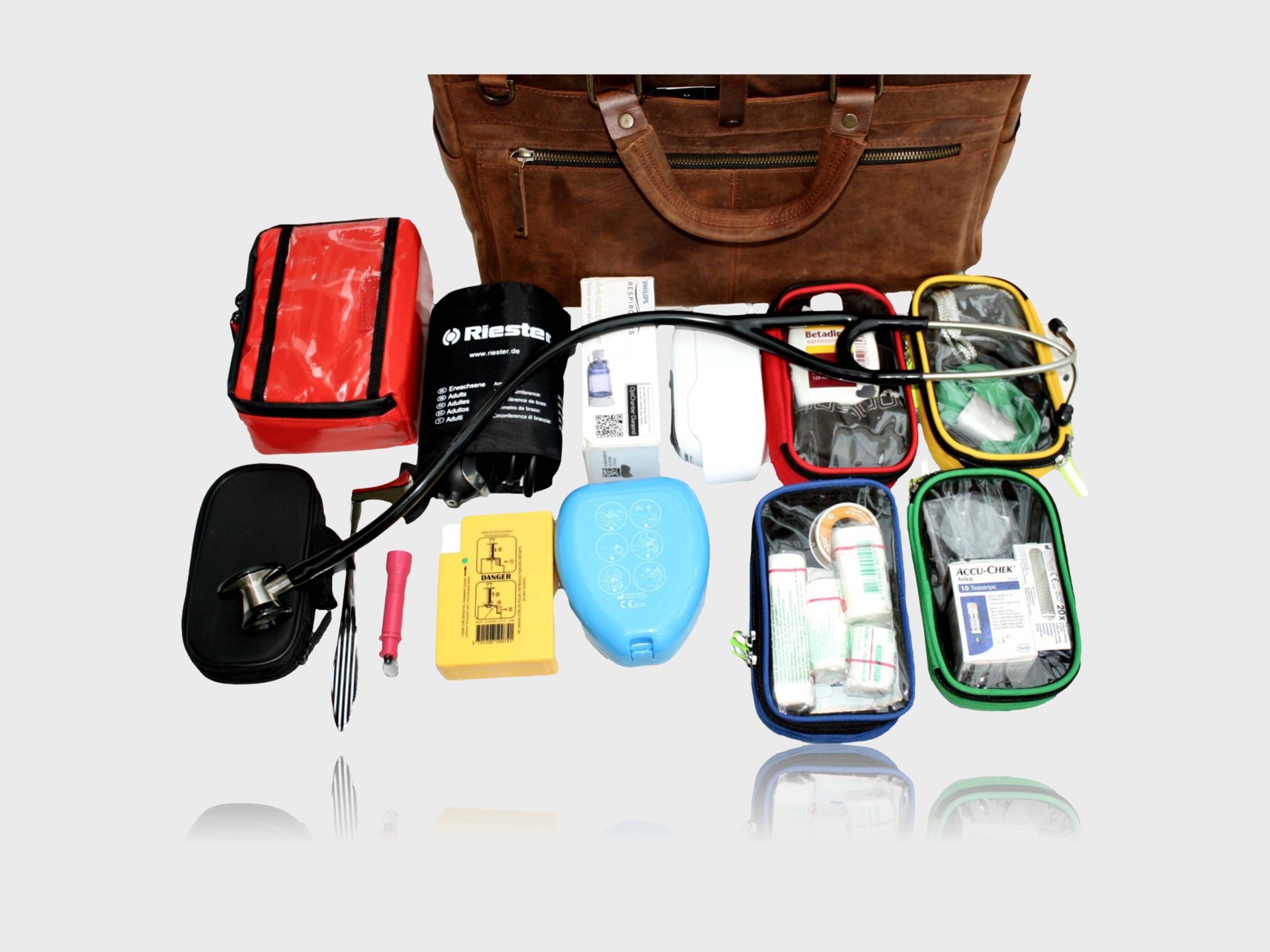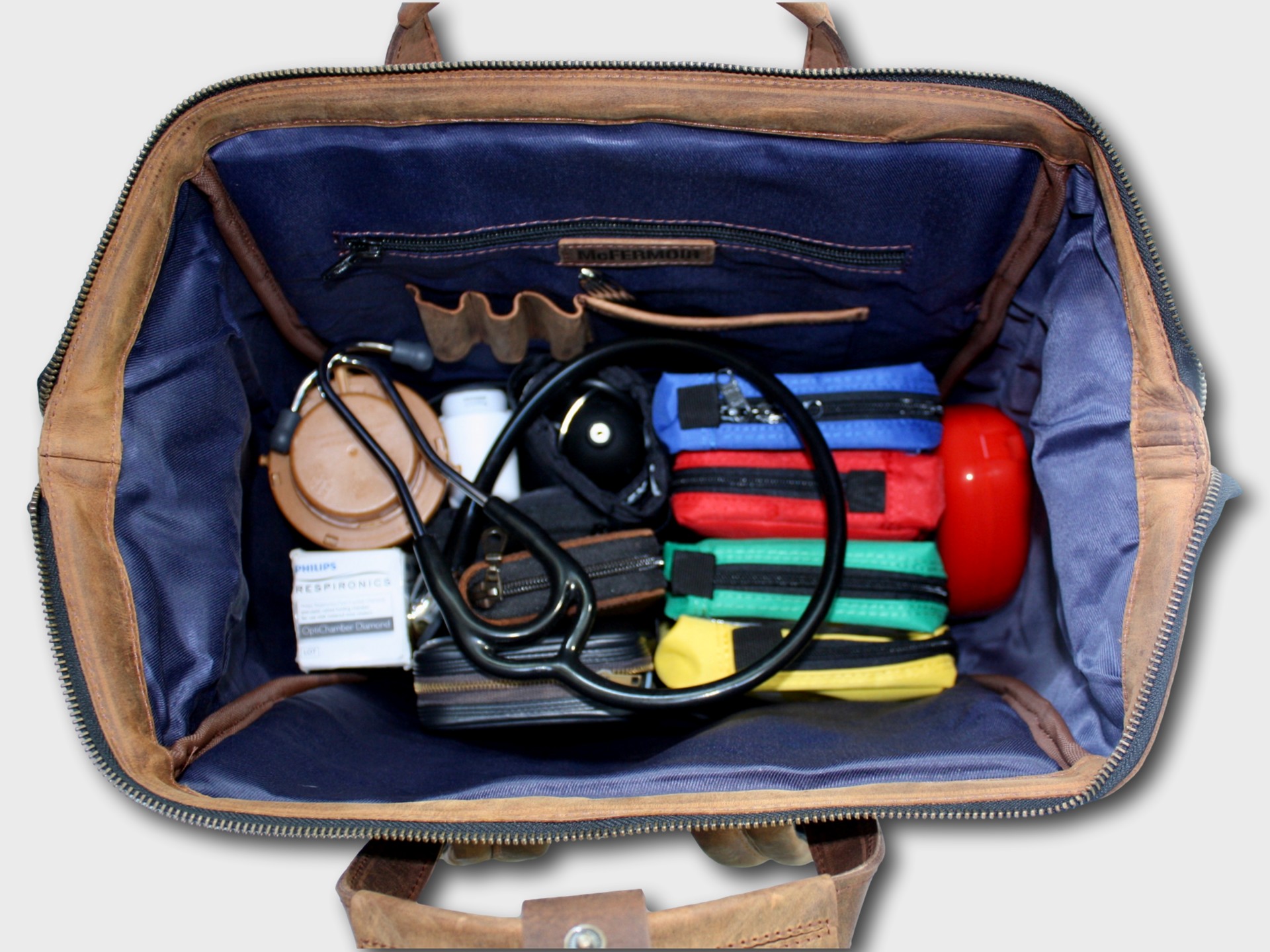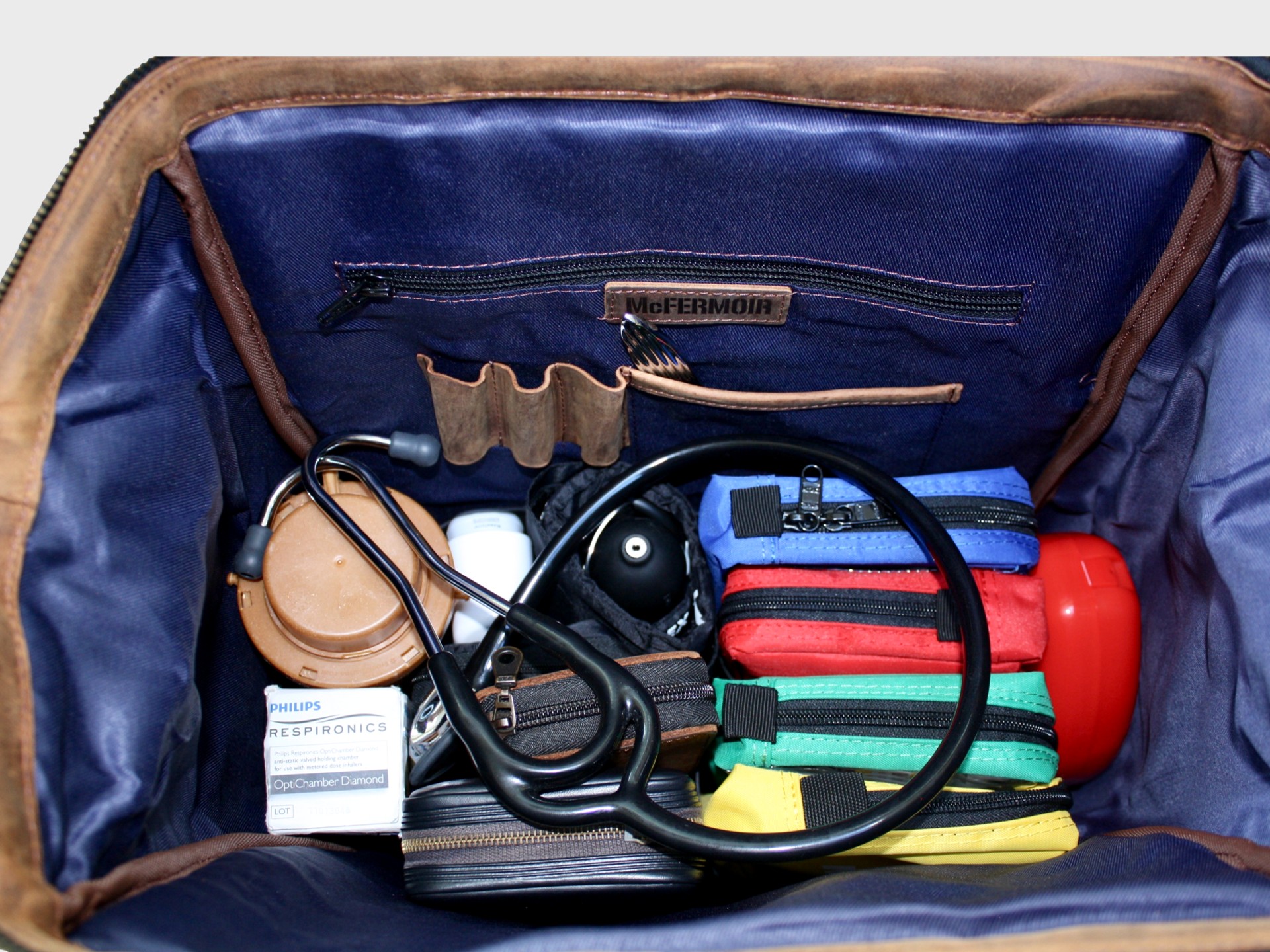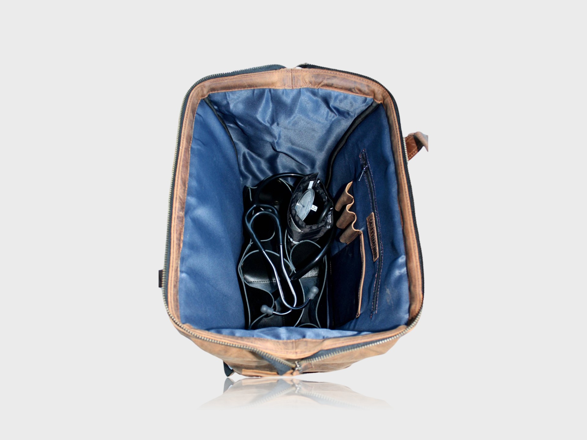- Removable leather compartment system – for organised storage of medical instruments