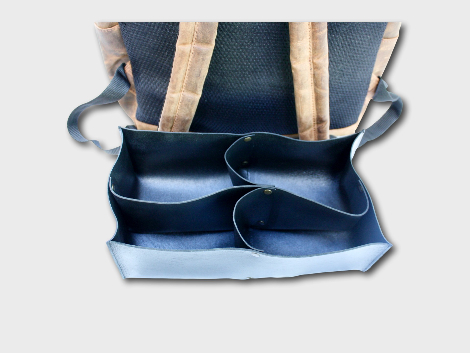 - Compartment system: Removable leather, approx. 28 x 15 x 10 cm, included
