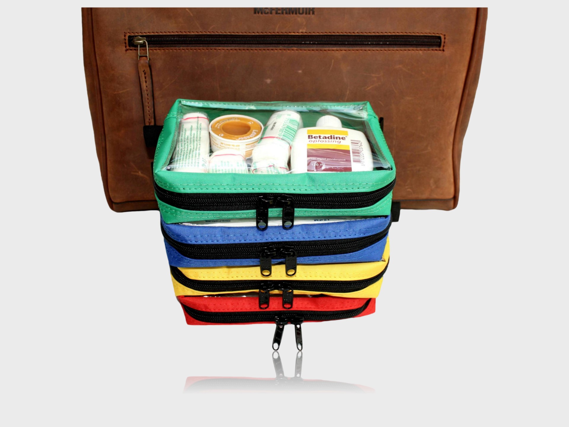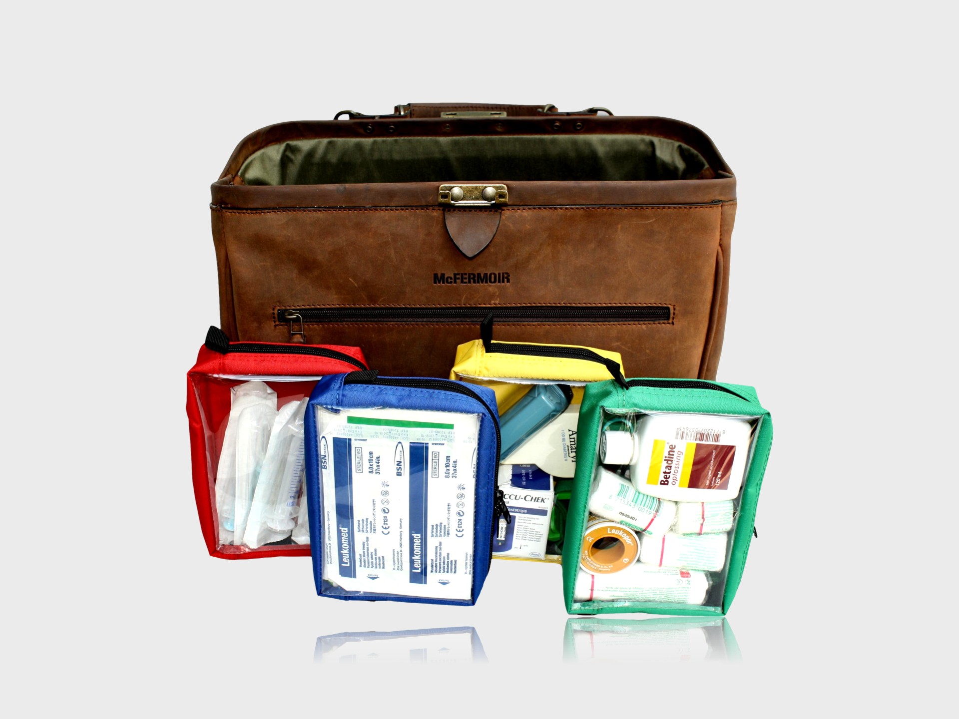 This set of 4 coloured polyester pouches with transparent window has been specially designed by McFermoir and Dokterstassen.nl to keep your doctor’s bag efficient and well-organised. Thanks to the bright colours and transparent windows, you always have direct view of the contents and never grab the wrong item during emergencies or house calls. Sustainably produced in Spain.